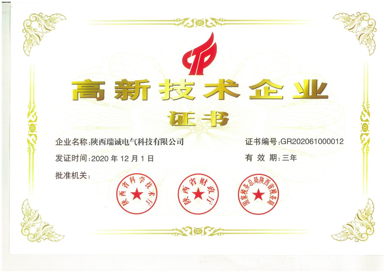 2021年是新的一(yī)年,陝西瑞誠電(diàn)氣科技有限公(gong)司也踏上🌏了新(xin)的征✂️程。在新年(nian)伊始,瑞誠電氣(qi)喜獲佳音--根據(ju)..《高新技術企業(yè)認定管理辦法(fa)》和《高新技術企(qi)業認定管理工(gong)作指引》的相關(guan)規定,憑借✍️專業(yè)的研發隊伍、雄(xióng)厚的技術實💔力(li)、持續的💃🏻創新能(néng)力、科學的企🔞業(yè)管理,陝西瑞誠(cheng)電氣科技有限(xiàn)公司順利認定(dìng)為...高新技術企(qi)業。近日,公司也(ye)已收到由陝西(xi)省科學技術廳(ting)、陝西省财政廳(tīng)、..稅務總局陝♍西(xī)省稅務局聯合(hé)頒發的“高新技(ji)術⛱️企業”認定證(zheng)書,由此正式邁(mai)入..高新技術企(qǐ)業行列。